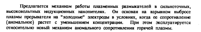 Предлагается механизм работы плазменных размыкателей в сильноточных, высоковольтных индукционных накопителях. Он основан на взрывном выбросе плазмы прерывателя на "холодные" электроды в условиях, когда ее сопротивление (аномальное) растет с уменьшением концентрации. При этом эксплуатируется относительно новый механизм аномального сопротивления горячей плазмы.