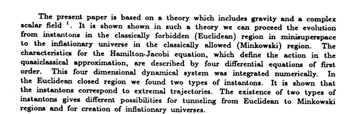 The present paper is based on a theory which includes gravity and a complex scalar field 1. It is shown shown in such a theory we can proceed the evolution from instantons in the classically forbidden (Euclidean) region in minisuperspace to the inflationary universe in the classically allowed (Minkowski) region. The characteristics for the Hamilton-Jacobi equation, which define the action in the quasiclassical approximation, are described by four differential equations of first order. This four dimensional dynamical system was integrated numerically. In the Euclidean closed region we found two types of instantons. It is shown that the instantons correspond to extremal trajectories. The existence of two types of instantons gives different possibilities for tunneling from Euclidean to Minkowski regions and for creation of inflationary universes.