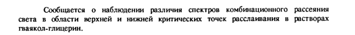 Сообщается о наблюдении различия спектров комбинационного рассеяния света в области верхней и нижней критических точек расслаивания в растворах гва якол-глицерин.