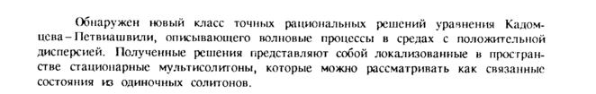 Обнаружен новый класс точных рациональных решений уравнения КадомцеваПетвиашвили, описывающего волновые процессы в средах с положительной дисперсией. Полученные решения представляют собой локализованные в пространстве стационарные мультисолитоны, которые можно рассматривать как связанные состояния из одиночных солитонов.