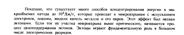 Показано, что существует много способов концентрирования энергии в микрообъемах катода до 104Дж/г, которые приводят к микровзрывам с испусканием электронов, плазмы, жидких капель металла и его паров. Этот эффект был назван эктонами. Если ток га участка микровзрыва выше критического, начинается процесс самоподдержания эктонов. Эктоны играют фундаментальную роль в большом числе электрических разрядов.