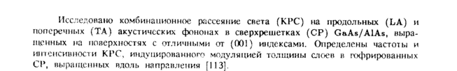 Исследовано комбинационное рассеяние света (КРС) на продольных (LA) и поперечных (ТА) акустических фононах в сверхрешетках (CP) GaAs/AlAs, выращенных на поверхностях с отличными от (001) индексами. Определены частоты и интенсивности КРС, индуцированного модуляцией толщины слоев в гофрированных CP, выращенных вдоль направления [113].