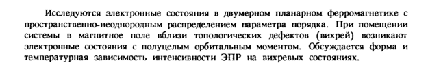 Исследуются электронные состояния в двумерном пленарном ферромагнетике с пространственно-неоднородным распределением параметра порядка. При помещении системы в магнитное поле вблизи топологических дефектов (вихрей) возникают электронные состояния с полуцелым орбитальным моментом. Обсуждается форма и температурная зависимость интенсивности ЭПР на вихревых состояниях.