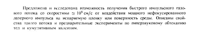 Предложена и исследована возможность получения бьютрого импульсного газового потока со скоростями ~ 10ъсм/с от воздействия мощного нефокусироваиного лазерного импульса на испаряемую пленку или поверхность среды. Описаны свойства такого потока и предварительные эксперименты по гиперзвуковому обтеканию тел и кумулятивным явлениям.