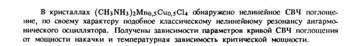 В кристаллах (СНзГШз)2Мпо,5Сио,5С14 обнаружено нелинейное СВЧ поглощение, по своему характеру подобное классическому нелинейному резонансу ангармонического осциллятора. Получены зависимости параметров кривой СВЧ поглощения от мощности накачки и температурная зависимость критической мощности.