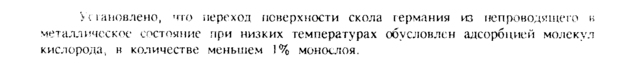 м ι а нов л е но, что переход поверхности скола германия из непроводящего в металлическое состояние при низких температурах обусловлен адсорбцией молекул кислорода, в количестве меньшем 1% монослоя.