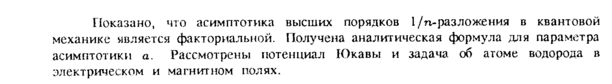 Показано, что асимптотика высших порядков 1/η-разложения в квантовой механике является факториальной. Получена аналитическая формула для параметра асимптотики а. Рассмотрены потенциал Юкавы и задача об атоме водорода в электрическом и магнитном полях.