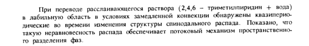 При переводе расслаивающегося раствора (2,4,6 триметилпиридин -f вода) в лабильную область в условиях замедленной конвекции обнаружены квазипериодические во времени изменения структуры спинодального распада. Показано, что такую неравновесность распада обеспечивает потоковый механизм пространственного разделения фаз.
