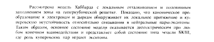 Рассмотрена модель Хаббарда с локальным отталкиванием и половинным заполнением зоны на гиперкубической решетке. Показано, что каноническое преобразование к электронам и дыркам обнаруживает их локальное притяжение и ку-перовскую неустойчивость относительно связывания в нейтральные пары-экситоньг Таким образом, основное состояние модели оказывается диэлектрическим при любом конечном взаимодействии и представляет собой состояние типа модели БКШ, где роль куперовских пар играют экситоны.