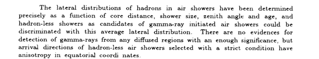 The lateral distributions of hadrons in air showers have been determined precisely as a function of core distance, shower size, zenith angle and age, and hadron-less showers as candidates of gamma-ray initiated air showers could be discriminated with this average lateral distribution. There are no evidences for detection of gamma-rays from any diffused regions with an enough significance, but arrival directions of hadron-less air showers selected with a strict condition have anisotropy in equatorial coordi nates.