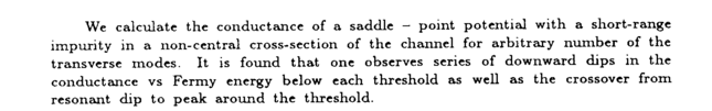 We calculate the conductance of a saddle point potential with a short-range impurity in a non-central cross-section of the channel for arbitrary number of the transverse modes. It is found that one observes series of downward dips in the conductance vs Fermy energy below each threshold as well as the crossover from resonant dip to peak around the threshold.