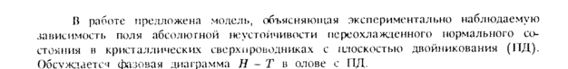 I] работе предложена модель, объясняющая экспериментально наблюдаемую зависимость поля абсолютной неустойчивости переохлажденного нормального состояния в кристаллических сверхпроводниках с плоскостью двойникования (ПД). Обсуждается Фазовая диаграмма Я Τ в олове с ПД.