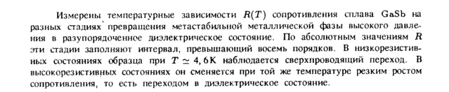 Измерены температурные зависимости R(T) сопротивления сплава GaSb на разных стадиях превращения метаетабилыюй металлической фазы высокого давления в разупорядочеиное диэлектрическое состояние. По абсолютным значениям Я эти стадии заполняют интервал, превышающий восемь порядков. В низкорезистив-ных состояниях образца при Г ~ 4,6К наблюдается сверхпроводящий переход. В высокорезистивных состояниях он сменяется при той же температуре резким ростом сопротивления, то есть переходом в диэлектрическое состояние.
