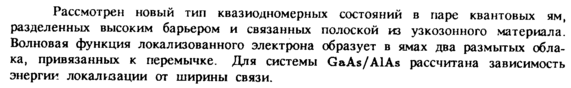 Рассмотрен новый тип квазиодномерных состояний в паре квантовых ям, разделенных высоким барьером и связанных полоской из узкозонного материала. Волновая функция локализованного электрона образует в ямах два размытых облака, привязанных к перемычке. Для системы GaAs/AlAs рассчитана зависимость энергии локализации от ширины связи.
