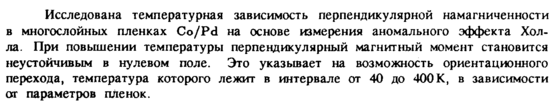 Исследована температурная зависимость перпендикулярной намагниченности в многослойных пленках Co/Pd на основе измерения аномального эффекта Холла. При повышении температуры перпендикулярный магнитный момент становится неустойчивым в нулевом поле. Это указывает на возможность ориентационного перехода, температура которого лежит в интервале от 40 до 400 К, в зависимости от параметров пленок.