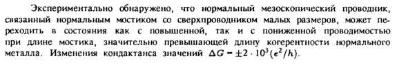 Экспериментально обнаружено, что нормальный мезоскопический проводник, связанный нормальным мостиком со сверхпроводником малых размеров, может переходить в состояния как с повышенной, так и с пониженной проводимостью при длине мостика, значительно превышающей длину когерентности нормального металла. Изменения кондактанса значений AG ±2 · 103(e2/h).