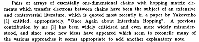 Pairs or arrays of essentially one-dimensional chains with hopping matrix elements which transfer electrons between chains have been the subject of an extensive and controversial literature, which is quoted most recently in a paper by Yakovenko [1] entitled, appropriately, "Once Again about Interchain Hopping". A previous contribution by me [2] has been widely criticised and even more widely misunderstood, and since some new ideas have appeared which seem to reconcile many of the various approaches it seems appropriate to add another explanatory note.