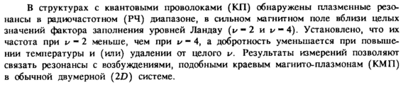 В структурах с квантовыми проволоками (КП) обнаружены плазменные резо-нансы в радиочастотном (РЧ) диапазоне, в сильном магнитном поле вблизи целых значений фактора заполнения уровней Ландау (и -2 и t/-4). Установлено, что их частота при и 2 меньше, чем при и 4, а добротность уменьшается при повышении температуры и (или) удалении от целого v. Результаты измерений позволяют связать резонансы с возбуждениями, подобными краевым магнито-плазмонам (КМП) в обычной двумерной (2D) системе.