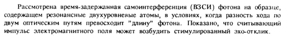 Рассмотрена время-задержанная самоинтерференция (ВЗСИ) фотона на образце, содержащем резонансные двухуровневые атомы, в условиях, когда разность хода по двум оптическим путям превосходит "длину" фотона. Показано, что считывающий импульс электромагнитного поля может возбудить стимулированный эхо-отклик.