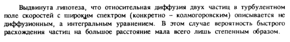 Выдвинута .гипотеза, что относительная диффузия двух частиц в турбулентном поле скоростей с широк^им спектром (конкретно колмогоровским) описывается не диффузионным, а интегральным уравнением. В этом случае вероятность быстрого расхождения частиц на большое расстояние мала всего лишь степенным образом.
