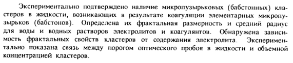 Экспериментально подтверждено наличие микропузырьковых (бабстонных) кластеров в жидкости, возникающих в результате коагуляции элементарных микропузырьков (бабстонов). Определена их фрактальная размерность и средний радиус для воды и водных растворов электролитов и коагулянтов. Обнаружена зависимость фрактальных свойств кластеров от содержания электролита. Экспериментально показана связь между порогом оптического пробоя в жидкости и объемной концентрацией кластеров.