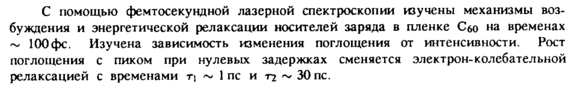 С помощью фемтосекундной лазерной спектроскопии изучены механизмы возбуждения и энергетической релаксации носителей заряда в пленке Сбо на временах ~ 100фс. Изучена зависимость изменения поглощения от интенсивности. Рост поглощения с пиком при нулевых задержках сменяется электрон-колебательной релаксацией с временами т\ ~ 1 пс и тг ~ 30 пс.