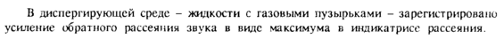 В диспергирующей среде жидкости с газовыми пузырьками зарегистрировано усиление обратного рассеяния звука в виде максимума в индикатрисе рассеяния.