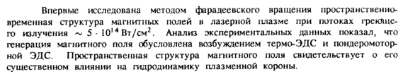 Впервые исследована методом фарадеевского вращения пространственно-временная структура магнитных полей в лазерной плазме при потоках грекяце-го излучения ~ 5 10м Вт/см2. Анализ экспериментальных данных показал, что генерация магнитного поля обусловлена возбуждением термо-ЭДС и пондеромотор-ной ЭДС. Пространственная структура магнитного поля свидетельствует о его существенном влиянии на гидродинамику плазменной короны.
