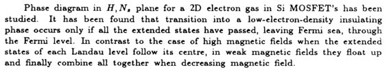 Phase diagram in Η, Nt plane for a 2D electron gas in Si MOSFET's has been studied. It has been found that transition into a low-electron-density insulating phase occurs only if all the extended states have passed, leaving Fermi sea, through the Fermi level. In contrast to the case of high magnetic fields when the extended states of each Landau level follow its centre, in weak magnetic fields they float up and finally combine all together when decreasing magnetic field.