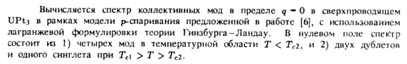Вычисляется спектр коллективных мод в пределе q 0 в сверхпроводящем UPt3 в рамках модели р-спаривания предложенной в работе [6], с использованием лагранжевой формулировки теории Гинзбурга-Ландау. В нулевом поле спектр состоит из 1) четырех мод в температурной области Τ < Тс2, и 2) двух дублетов и одного синглета при Тс\ > Г > Тсг.