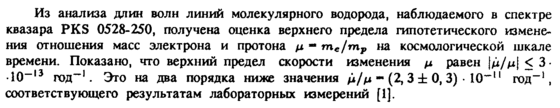 Из анализа длин волн линий молекулярного водорода, наблюдаемого в спектре квазара PKS 0528-250, получена оценка верхнего предела гипотетического изменения отношения масс электрона и протона μ те/тр на космологической шкале времени. Показано, что верхний предел скорости изменения μ равен < 3 • Ю-13 год-1. Это на два порядка ниже значения μ/μ (2, 3 ± 0, 3) · 10~" год"1, соответствующего результатам лабораторных измерений [1].