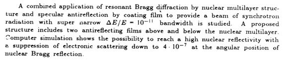 A combined application of resonant Bragg diffraction by nuclear multilayer structure and specular antireflection by coating film to provide a beam of synchrotron radiation with super narrow ΔΕ/Ε 10~" bandwidth is studiedA proposed structure includes two antireflecting films above and below the nuclear multilayer. Computer simulation shows the possibility to reach a high nuclear reflectivity with a suppression of electronic scattering down to 4 · 10~7 at the angular position of nuclear Bragg reflection.