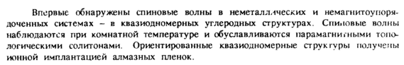 Впервые обнаружены спиновые волны в неметаллдческих и немагнитоупоря-доченных системах в квазиодномерных углеродных структурах. Спиновые волны наблюдаются при комнатной температуре и обуславливаются парамагнитными топологическими солитонами. Ориентированные квазиодномерные структуры получены ионной имплантацией алмазных пленок.