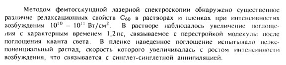Методом фемтосекундной лазерной спектроскопии обнаружено существенное различие релаксационных свойств Сбо в растворах и пленках при интенсивностих возбуждения 1010 10" Вт/см2. В растворе наблюдалось увеличение поглощения с характерным временем 1,2пс, связываемое с перестройкой молекулы после поглощения кванта света. В пленке наведенное поглощение испытывало неэкспоненциальный распад, скорость которого увеличивалась с ростом интенсивности возбуждения, что связывается с синглет-синглетной аннигиляцией.