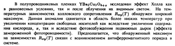 В полупроводниковых пленках УВагСизОб+х исследован эффект Холла как в равновесных условиях, так и после облучения их видимым светом. На температурных зависимостях холловского сопротивления Rxy(T) обнаружен широкий максимум. Данная аномалия сдвигается в область более низких температур при увеличении концентрации свободных носителей как вследствие увеличения содержания кислорода, х, так и вследствие фотовозбуждения подвижных дырок (эффекта замороженной фотопроводимости). Предполагается, что обнаруженный максимум на зависимостях Rxy(T) связан с возникновением антиферромагнитного порядка в системе.