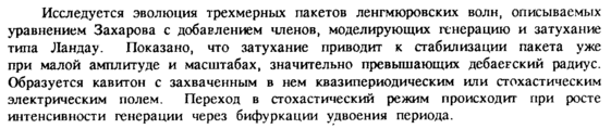 Исследуется эволюция трехмерных пакетов ленгмюровских волн, описываемых уравнением Захарова с добавлением членов, моделирующих генерацию и затухание типа Ландау. Показано, что затухание приводит к стабилизации пакета уже при малой амплитуде и масштабах, значительно превышающих дебаегский радиус. Образуется кавитон с захваченным в нем квазипериодическим или стохастическим электрическим полем. Переход в стохастический режим происходит при росте интенсивности генерации через бифуркации удвоения периода.