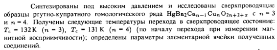 Синтезированы под высоким давлением и исследованы сверхпроводящие образцы ртутно-купратного гомологического ряда HgBa2Can_i Cun02n+2+ χ с η = 3 и η 4. Получены следующие температуры перехода в сверхпроводящее состояние: Тс 132 К (п 3), Тс 131 К (п 4) (по началу перехода при измерении магнитной восприимчивости); определены параметры элементарной ячейки полученных соединений.