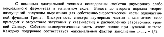 С помощью диаграммной техники исследованы свойства двумерного слабо неидеального ферми-газа в магнитном поле. Вплоть до второго порядка теории возмущений получены выражения для собственно-энергетической части одночастич-ной функции Грина. Дискретность спектра двумерных частиц в магнитном поле приводит к отсутствию затухания у квазичастиц и расщеплению затравочных уровней Ландау. Собственно-энергетическая часть имеет полюс при нулевой частоте. Каждому подуровню соответствует максимальный фактор заполнения i/mai = 1/2.