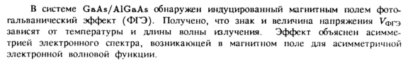 В системе GaAs/AlGaAs обнаружен индуцированный магнитным полем фотогальванический эффект (ФГЭ). Получено, что знак и величина напряжения УФГЭ зависят от температуры и длины волны излучения. Эффект объяснен асимметрией электронного спектра, возникающей в магнитном поле для асимметричной электронной волновой функции.