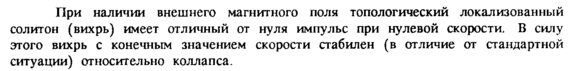 При наличии внешнего магнитного поля топологический локализованный солитон (вихрь) имеет отличный от нуля импульс при нулевой скорости. В силу этого вихрь с конечным значением скорости стабилен (в отличие от стандартной ситуации) относительно коллапса.