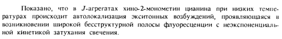 Показано, что в J-агрегатах хино-2-монометин цианина при низких температурах происходит автолокализация экситонных возбуждений, проявляющаяся в возникновении широкой бесструктурной полосы флуоресценции с неэкспоненциаль-ной кинетикой затухания свечения.