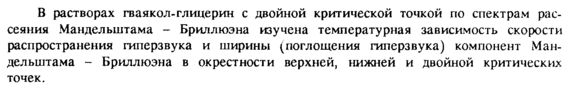В растворах гваякол-глицерин с двойной критической точкой по спектрам рассеяния Мандельштама Бриллюэна изучена температурная зависимость скорости распространения гиперзвука и ширины (поглощения гиперзвука) компонент Мандельштама Бриллюэна в окрестности верхней, нижней и двойной критических точек.