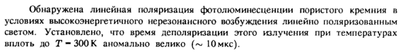 Обнаружена линейная поляризация фотолюминесценции пористого кремния в условиях высокоэнергетичного нерезонансного возбуждения линейно поляризованным светом. Установлено, что время деполяризации этого излучения при температурах вплоть до Τ300 К аномально велико (~ Юмкс).