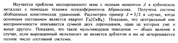 Изучается проблема изолированного иона с полным моментом J в кубических металлах с помощью техники псевдофермионов Абрикосова. Получена система обобщенных кинетических уравнений. Рассмотрен пример J β 5/2 в случае, когда основным состоянием является квартет Г«(СеВб)Показано, что центральный пик восприимчивости описывается суммой двух лоренцианов, один из которых уже и выше другого. Показано, что такое мультимодовое поведение — общее явление в случае, если вырожденный мультиплет не является дублетом и им не исчерпывается полное число состояний системы.