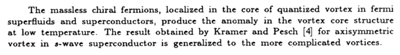 The massless chiral fermions, localized in the core of quantized vortex in fermi superfluids and superconductors, produce the anomaly in the vortex core structure at low temperature. The result obtained by Kramer and Pesch [4] for axisymmetric vortex in a-wave superconductor is generalized to the more complicated vortices.