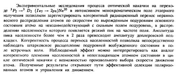 Экспериментальные исследования процесса оптической накачки на переходе }Рг —>3 D2 (Is; —» 2p8)Ne20 в интенсивном монохроматическом поле лазерного излучения позволили зарегистрировать когерентный радиационный перенос неравновесного распределения атомов по скоростям по вырожденным подуровням основного состояния атома на невзаимодействующий с сильным полем подуровень, в распределении населенности которого появляется резкий пик на частоте поля. Амплитуда пика населенности более чем в 2 раза превосходит амплитуду доплеровской подкладки. Когерентность процесса переноса населенностей позволила непосредственно наблюдать штарковское расщепление подуровней возбужденного состояния в поле встречных волн. Наблюдаемый эффект можно интерпретировать как аналог когерентного пленения населенностей в непоглощающем атомном состоянии в цикле оптической накачки с возможностью произвольного выбора скорости движения атома. Полученные результаты открывают пути эффективной селекции поляризованных атомов и управления их движением.