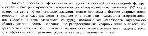 Описана простая и эффективная методика скоростной наносекундной фоторегистрации быстрых процессов, использующая самоукороченные импульсы УФ света лазера на азоте. С ее помощью выявлены новые процессы в физике ударных волн; генерация цуга ударных волн в воздухе и в воде при пульсациях энерговыделения (колебания тока разрядного контура), позволяющая исследовать внутреннюю область ударной волны; направленное распространение ударных волн в потоке нагретого или легкого газа, отмечена возможность использования цуга ударных волн для эффективного отражения радио и светового излучения и т.п.