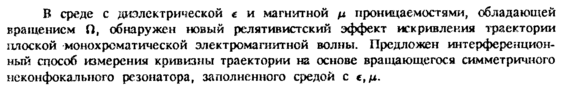 В среде с диэлектрической « и магнитной μ проницаемостями, обладающей вращением Ω, обнаружен новый релятивистский эффект искривления траектории плоской монохроматической электромагнитной волны. Предложен интерференционный способ измерения кривизны траектории на основе вращающегося симметричного неконфокального резонатора, заполненного средой с «,μ.