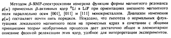 Методом /3-ЯМР-спектроскопии измерена функция формы магнитного резонанса д(и?) примесных /3-активных ядер 81л в LiF при ориентациях внешнего магнитного поля параллельно осям [001], [011] и [111] монокристаллов. Диапазон изменения д(и) составляет почти пять порядков. Показано, что гипотеза о нормальных флук-туациях локального магнитного поля на примесных ядрах в сочетании с общими принципами теории необратимых процессов дает достаточно общее и элементарное описание фазовой релаксации этих ядер, удобное для интерпретации экспериментов.