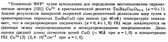 "Усиленный .ЯМΡ* тулия использован для определения местоположения парамагнитных центров (ПЦ) Си2+ в кристаллической решетке ТтВагСизОб+х (ж~0~-1). Анализ результатов измерений скоростей спин-решеточной релаксации ядер тулия в ориентирванных порошках TmBaCuO при низких (до 40 мК) температурах показывает, что в сверхпроводящих соединениях (а? 0, 4-r 1, 0) ГЩ меди локализуются на границах между, сверхпроводящими и несверхпроводящими микродоменами. Даны оценки средней длины сегментов цепей СиО (~ 90А при χ -1,0) и концентрации ПЦ Си2+(2) (2,4· 1019см"3 при ж-1,0).